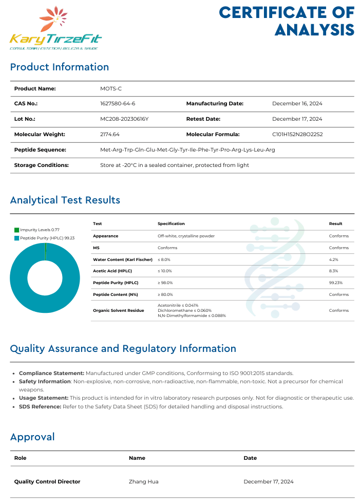 MOTS-C ainda não possui Certificação ANVISA no Brasil, e não há registro de aprovação em agências internacionais. O uso "off label" deverá ser feito exclusivamente sob acompanhamento médico.